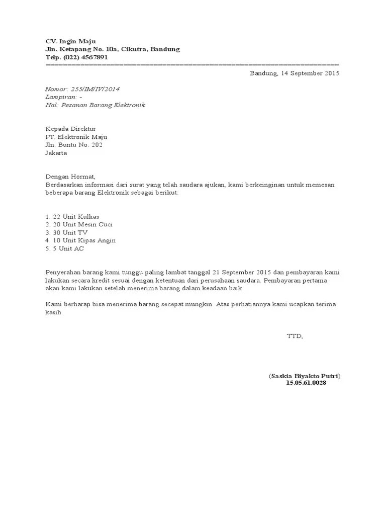 Pembayaran terhadap seluruh pesanan kami, akan dilaksanakan 2 hari . Beberapa diantaranya adalah surat pesanan barang atk, surat pemesanan makanan, surat pesanan barang . Keseluruhan barang yang kami pesan harap diterima selambatlambatnya tanggal 31 agustus 2015. Untuk lebih jelasnya berikut saya bagikan contoh surat pemesanan barang yang baik dan benar: Mirip dengan definisi letter of order, tujuan surat perintah hampir sama dengan artinya.