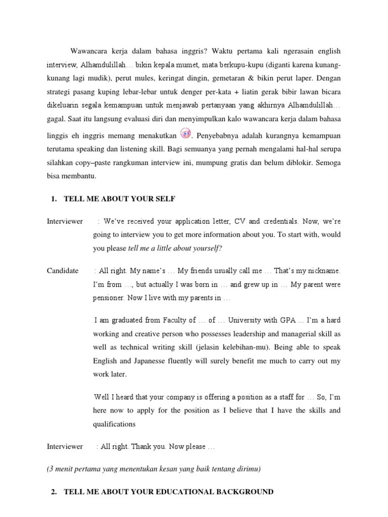 Dalam job interview selalu yang ditanyakan adalah tentang qualification, bagaimana cara menceritakannya? Kemampuan bahasa inggris saat ini menjadi salah satu faktor penting yang diharapkan untuk dimiliki oleh para pelamar pekerjaan di banyak . Jobs and i believe that i have the skills and passion to grow in this job. Apakah anda memiliki pengalaman pada . Dalam pertanyaan interview bahasa indonesia atau bahasa inggris, pertanyaan.
